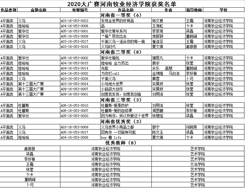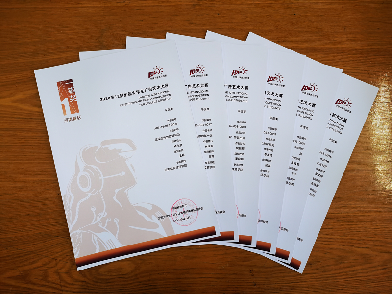 在近期落下帷幕的第十二届全国大学生广告艺术大赛中,pg电子官方网站视觉传达专业学生取得了骄人成绩。共获得河南省赛区省级一等奖6项、二等奖8项、三等奖3项、优秀奖3项。同时,pg电子官方网站卜可、董晓峰、梁磊、张莹、卞卡、姜薇薇、王霜、李好敏8位教师被评为河南赛区省级“优秀指导教师”。