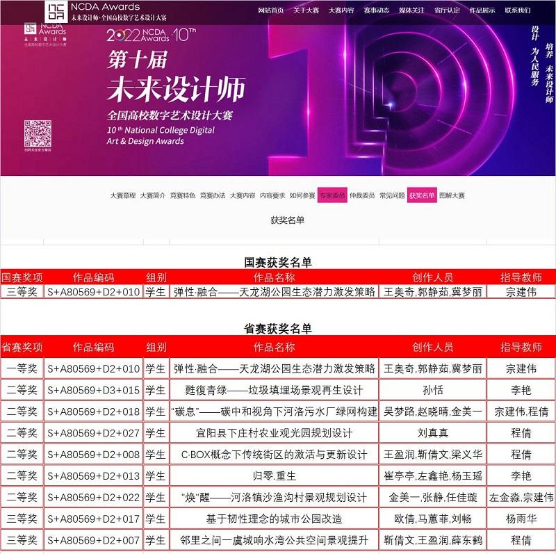 近日,由工业和信息化部人才交流中心主办的“第十届未来设计师·全国高校数字艺术设计大赛”(NCDA)顺利落下帷幕,pg电子园林学子摘得国家三等奖1项,河南省一等奖1项、二等奖6项、三等奖2项。