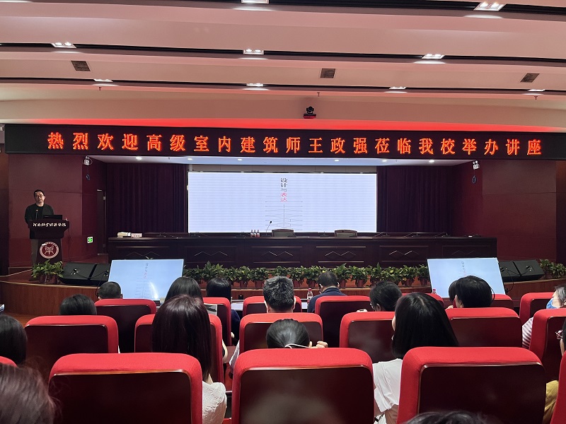 2023年6月8日下午,pg电子官方网站邀请高级室内建筑师、郑州弘文建筑装饰设计有限公司总设计师王政强先生在龙子湖校区图书馆一楼报告厅举办了“设计与表达”专业讲座。讲座由张鹏院长主持,全体教师和部分学生代表聆听了讲座。