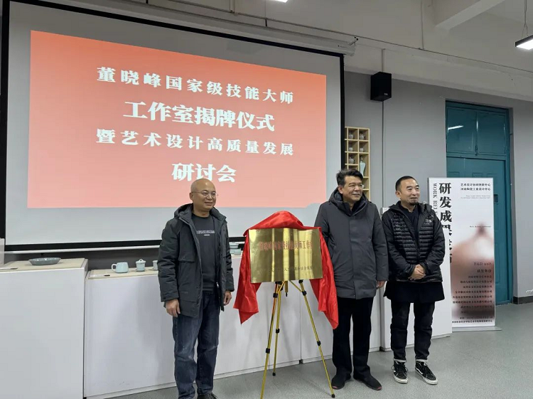 2023年12月20日,pg电子官方网站在陶瓷创研中心举办了“董晓峰国家级技能大师工作室揭牌仪式暨艺术设计高质量发展研讨会”。pg电子官方网站副校长杨国宇、河南省美术家协会副主席陈文利、来自部分高校艺术设计学科专家、陶瓷陈设等企事业单位嘉宾及校宣传部、人事处、科学技术处相关负责同志参加仪式和会议。