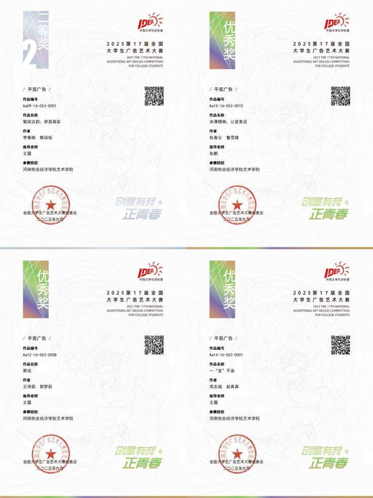 据了解,全国大学生广告艺术大赛(大广赛)由教育部高等教育司指导,中国高等教育学会、教育部高等学校新闻传播学类专业教学指导委员会共同主办,是教育部认可的84项全国性学科竞赛之一。作为国内规模最大、覆盖高校最广、参与人数最多、作品水准最高的文科类权威赛事,大广赛始终致力于激发大学生的创意思维与实践能力,推动艺术设计教育的创新与发展。