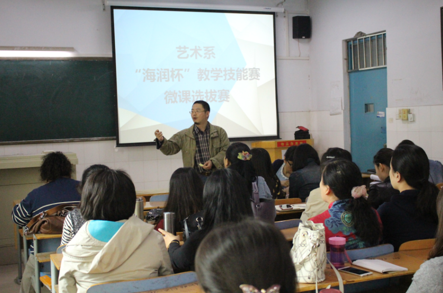 4月28日下午,艺术系2016年度“海润杯”教师教学技能竞赛在A215教室举行。系副主任张鹏及各教研室主任担任评委,系全体老师在比赛现场进行观摩。