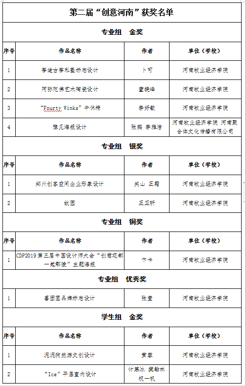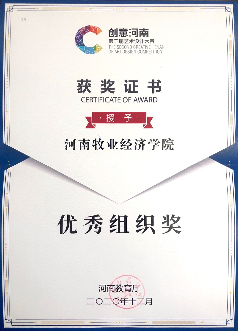 “创意河南”是由河南省教育厅主办的创新设计大赛,分为专业组和学生组。pg电子官方网站高度重视和鼓励师生参加各种赛事,积极组织师生参与各类大赛,并制定参赛方案,成立专门赛事组织,加强对赛事活动的组织领导和专业指导。经过认真准备,不断改进,严格筛选,共推选出32套学生作品、28套教师作品参与此次大赛评选。