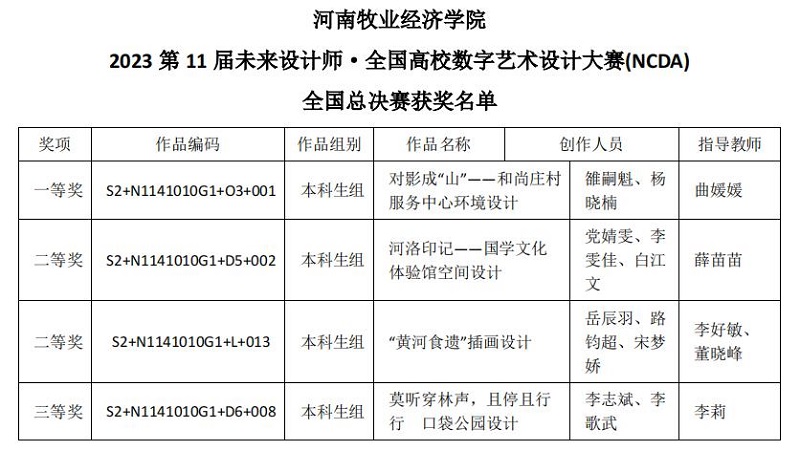 近日,第11届未来设计师·全国高校数字艺术设计大赛(NCDA)国家级和省级赛奖项公布,我校大学生获得国家级一等奖1项,二等奖2项,三等奖1项;省级一等奖7项,二等奖16项,三等奖16项。