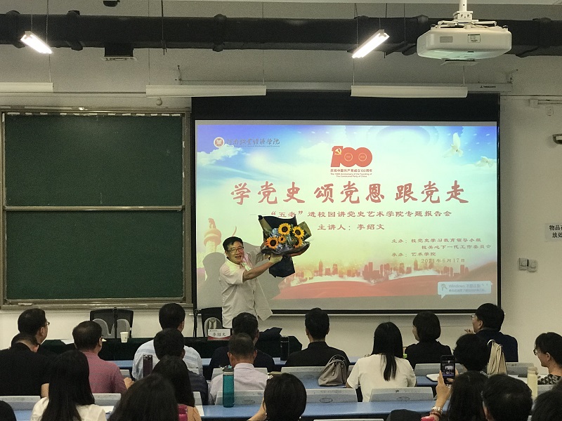会议伊始,参会人员一同观看了《学党史、颂党恩、跟党走“五老”进校园讲党史活动》和《百年百句祝华诞》宣传片。接着,李绍文教授以站起来、富起来、强起来为线索,全面回顾了党的百年历史、百年丰功伟绩,用一个个鲜活的事例,为全体师生讲述了我们党如何带领广大人民从过去的封闭落后到今天的独立自主,从过去的温饱不足到今天的全面小康,从过去的积贫积弱到今天的繁荣富强。整场报告内涵丰富,语言风趣,即是一堂生动的党史课,也是一堂感人的爱国主义教育课,让在场师生深受启发,收获很大;同时李教授的报告饱含着对党的忠诚热爱、饱含着对党史的深刻理解,饱含着对党的事业坚定信心,让在场每位师生强烈感受到一个老党员、老干部的理想信念、境界追求。李教授的报告,脉络清晰,内容丰富,感染力强,充分展示了一个老党务工作者对党的深厚感情,体现了一个老教授严谨的治学品格,和扎实深厚的文化功底,为在场的每位师生树立了学习榜样。最后,学生党员代表向李教授献上鲜花表达感谢。