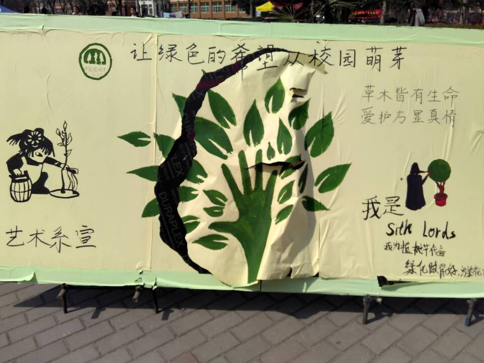 2、为增强我系广大师生珍惜绿色的责任心,积极践行高校学子环保理念、展现当代高校大学生的环保意识和主人公意识,艺术系举办了植树节爱心标语挂牌活动。艺术系各班同学和团学会成员在学校绿化带参与爱心挂牌活动。设计是艺术系的特长,设计的爱心标语牌各式各样,全系一共做了35爱心标语牌。从学校中心红色雕塑到校门口,每两棵树挂一个爱心标语,一共为80棵树挂上牌子。此次活动,艺术系同学们积极参与,作为一名学生,我们有责任也有义务为我们和谐而美好的家园努力;作为一名公民,我们更应该为我们的后代撑起一片绿色之家,我们深刻理解了“一人一颗树,人人一片森林”的美好理念。