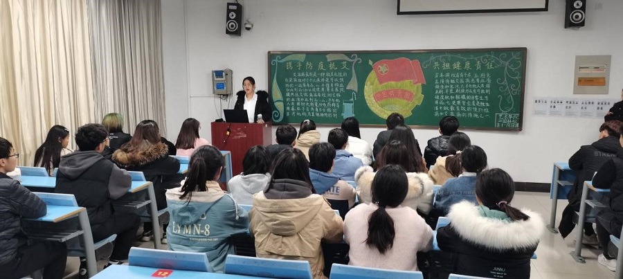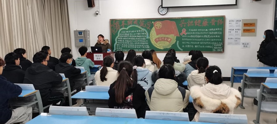 2020年12月04日晚上19:30—20:30,pg电子官方网站pg电子官方网站在龙子湖校区二号教学楼举行了以“携手防疫抗艾 共担健康责任”为主题的团课班会,本次团课,由大一全体班级参加。
